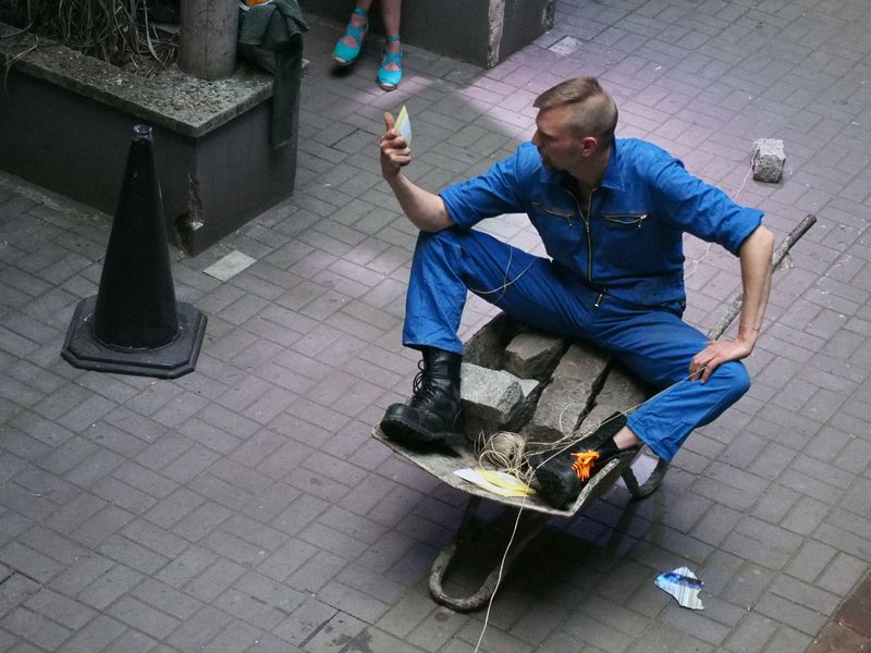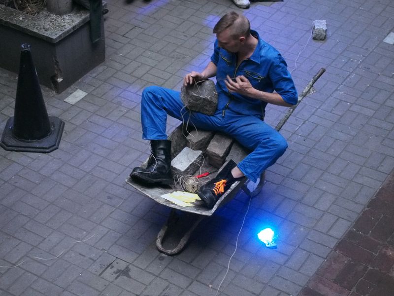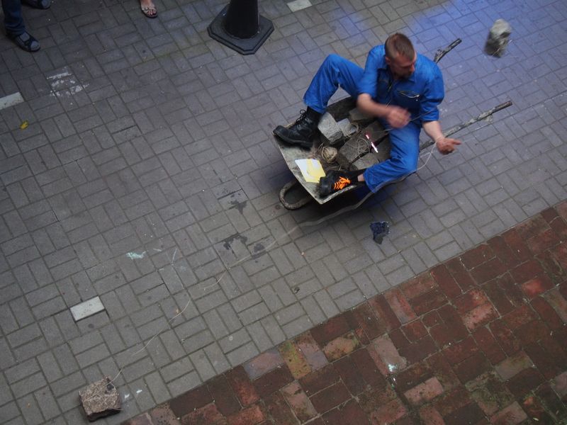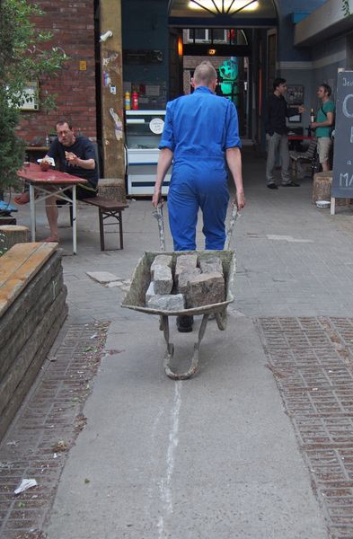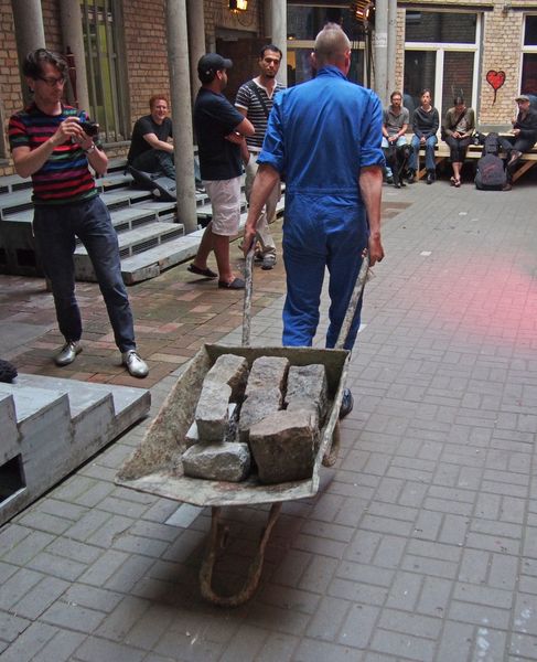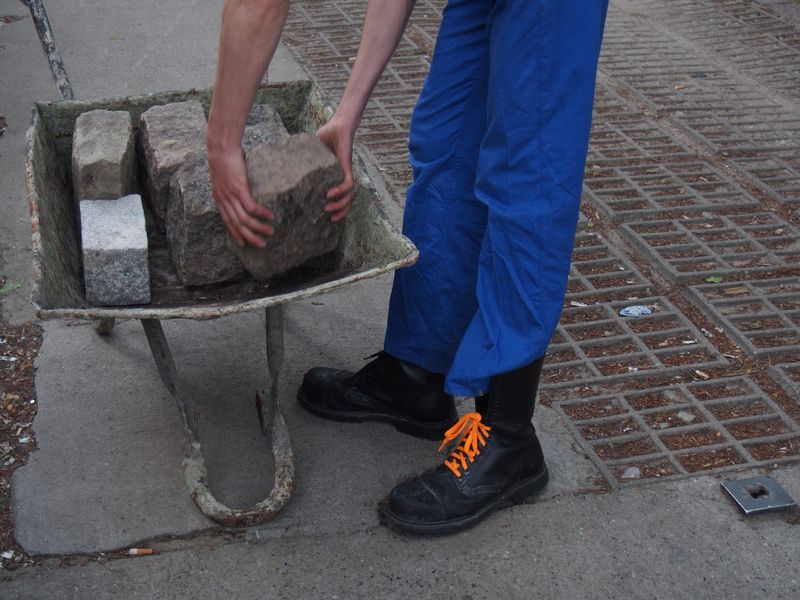 Ein mann tritt in der ferne auf, er wirft steine in eine karre, die kein rad mehr hat.