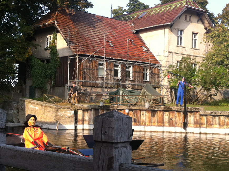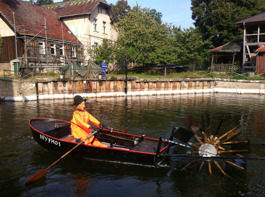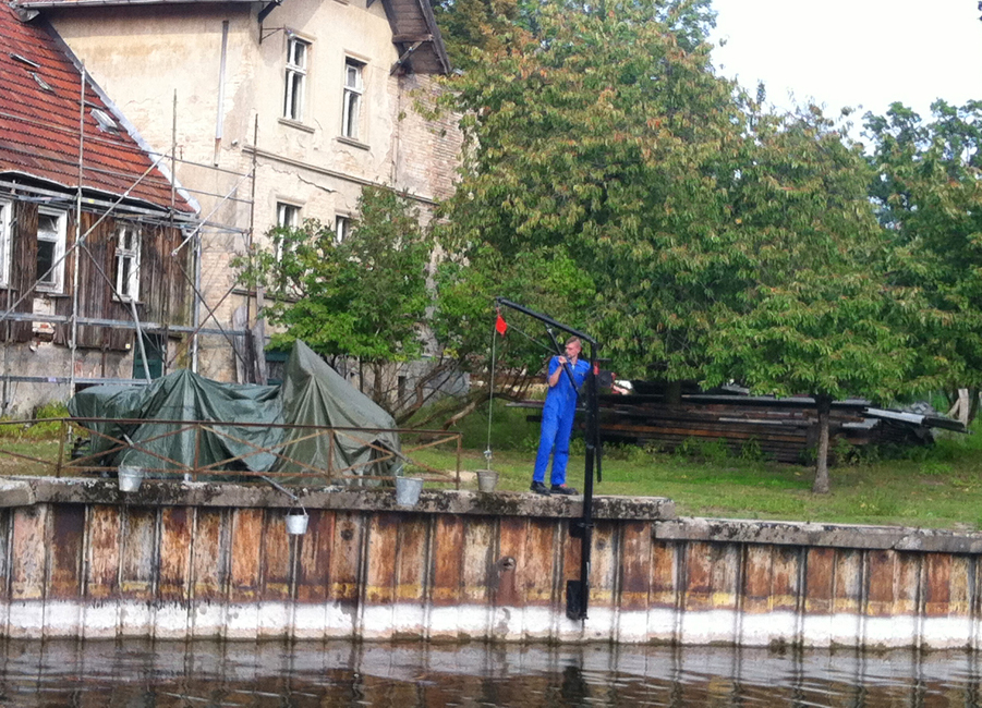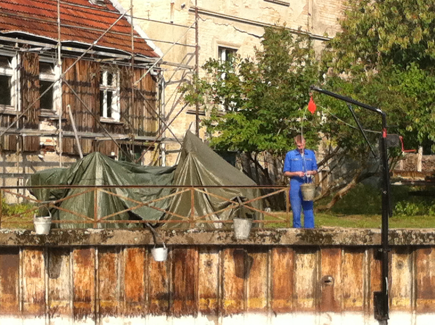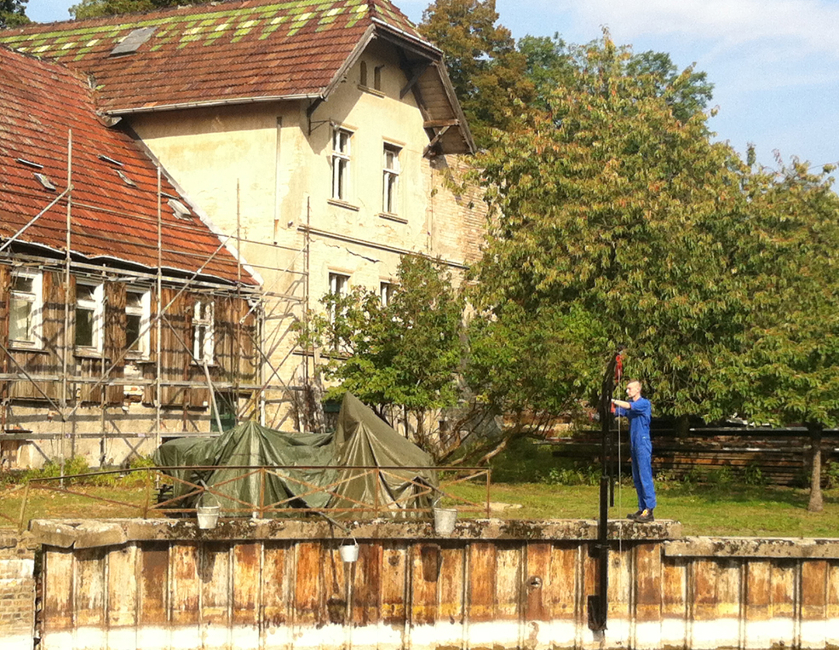 Diese halten das Wasser nicht. Es rinnt aus ihnen hinab, zurück in den Mühlgraben. Der Mann befestigt den Eimer wieder an der Winde und fährt mit seiner Tätigkeit fort.