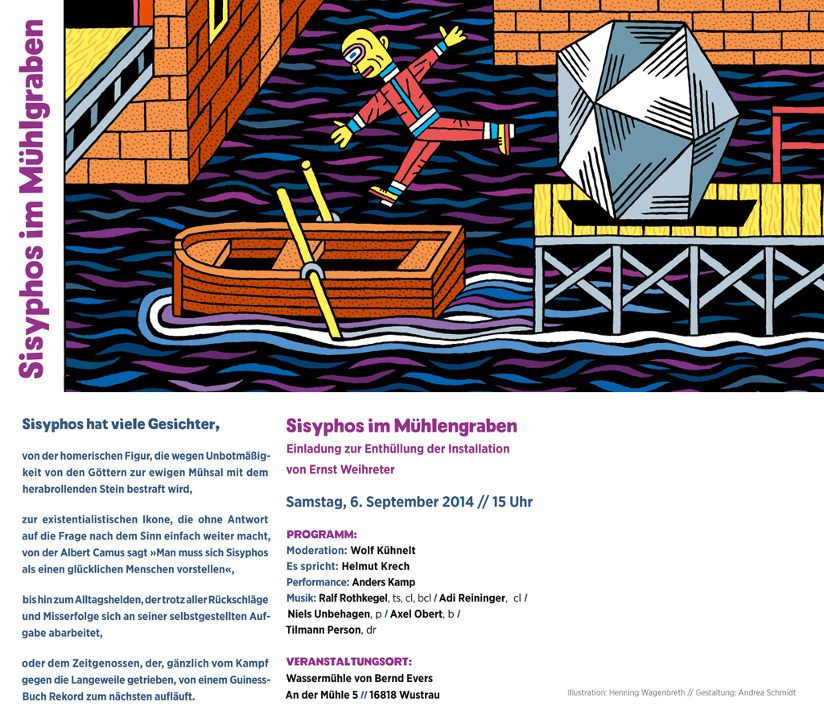 Ein Mann steht an der anderen Seite eines kleinen Fließgewässers neben einer Mühle. Er kurbelt an einer Seilwinde, daran ein Eimer, der sich langsam in Wasser senkt. Er wechselt die Richtung der Kreisbewegung, befördert den Eimer nach oben, bis knapp über die Kante der Uferbefestigung, löst den Haken vom Eimer, trägt ihn nach links und gießt das Wasser in einen von drei Eimern, die über dem Flüsschen hängen.