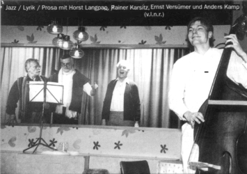 JAZZ/LYRIK/PROSA mit Horst Langpap, Rainer Karsitz, Ernst Versümer DIE KASSETTE von Carl Sternheim als Seidenschnur, JAZZLYRIKPROSA, Revue, als Faktotum & am Kontrabass, KÖNIGSKINDER von Georg Seidel als Prinz Peter, SCHICHT (UA) von Thilo Reffert als Herakles, Polizist, Pharmavertreter & Gitarre & RUMPELSTILZCHEN, nach den Gebrüdern Grimm als Piff in der Regie von Markus Dietze DER KAUKASISCHE KREIDEKREIS von Bertolt Brecht als Bauer, Adjutant & Jussup & DIE BREMER STADTMUSIKANTEN, nach den Gebrüdern Grimm, als Prinz Bleichenwang in der Regie von Goswin Moniac FAST FAUST von Albert Frank als Heiner (d.h. Gretchen, Mephisto, Wagner, Erdgeist & E-Gitarre) & DER MESSIAS von Patrick Barlowe als Bernhard (Jungfrau Maria, Herodes, Erzengel Gabriel, ... & Kontrabass) in der Regie von Albert Frank PETER PAN von Barrie/Kästner als der feine Starkey in der Regie von Birgit Eckenweber BEN LIEBT ANNA nach P.Härtling als Bernie, in der Regie von Andreas Steinke BYE BYE ANDREA DORIA, Revue von Uwe Bautz als werktätiger arbeitsloser Urlauber in der Regie von Olga Wildgruber FAMILIENGESCHICHTEN.BELGRAD von Bljana Srbljanovic als Andrija in der Regie von G. Weimann TRIUMPH DER LIEBE von P.C. de Marivaux als Prinz Agis in der Regie von K. Meyer - Freilicht-sommertheater | ||||||||||||